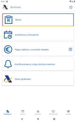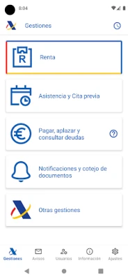 Las gestiones que están disponibles desde la APP son las de Renta, cita previa, pagar aplazar y consultar deudas, notificaciones y cotejo de documentos, herramientas de asistencia virtual, acceso a una videollamada previamente acordada, datos censales y domicilio fiscal, suscripción a avisos informativos, suscripciones y buscador de bienes en subastas, firma de documentos y consulta de documentos firmados.